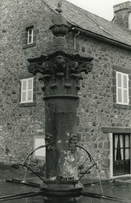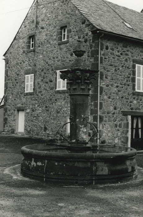 En 1872, la municipalité constate que le bourg est dépourvu d'abreuvoirs publics et qu'il convient d'aménager une fontaine qui sera alimentée par la déviation de sources surgissant dans le pré Farjou. Construite en pierre de Volvic, la fontaine se compose d'un bassin circulaire et d'une colonne centrale à quatre jets. L'eau jaillit de la bouche de quatre masques barbus. Un chapiteau corinthien surmonte la colonne. Bien que stylisé, ce chapiteau présente toutes les caractéristiques du modèle antique : astragale torique, corbeille feuillagée, crosses et volutes, tailloir frappé d'une fleur par face. Une coupole à extrados orné de fausses écailles couvre ce chapiteau. Cette coupole est amortie par un vase garni d'une sorte de pomme de pin, elle-même surmontée d'un buste de Marianne.