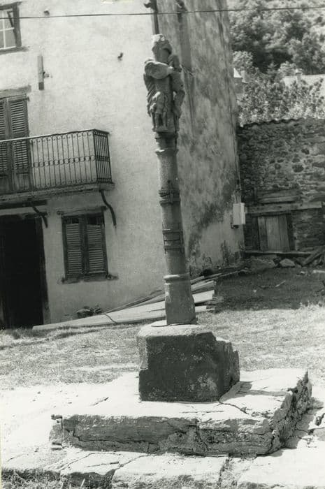 Croix du 15e siècle qui aurait été donnée par les Templiers installés au hameau de Tempel, dépendance de la commanderie de Celles. Edifiée en basalte, cette croix de 1, 90 mètre se compose d'une base formant un double emmarchement ; d'un socle carré amorti en facettes prismatiques et baguées, monolithe avec le fût cylindrique ; d'une croix aux extrémités fleuronnées et ornée de personnages (Christ en croix sur la face Est ; personnage féminin sur la face ouest). Une girouette surmonte cette croix.