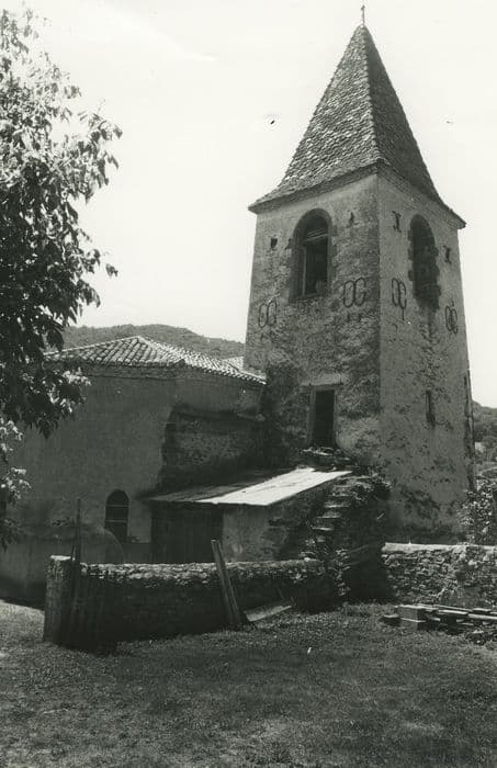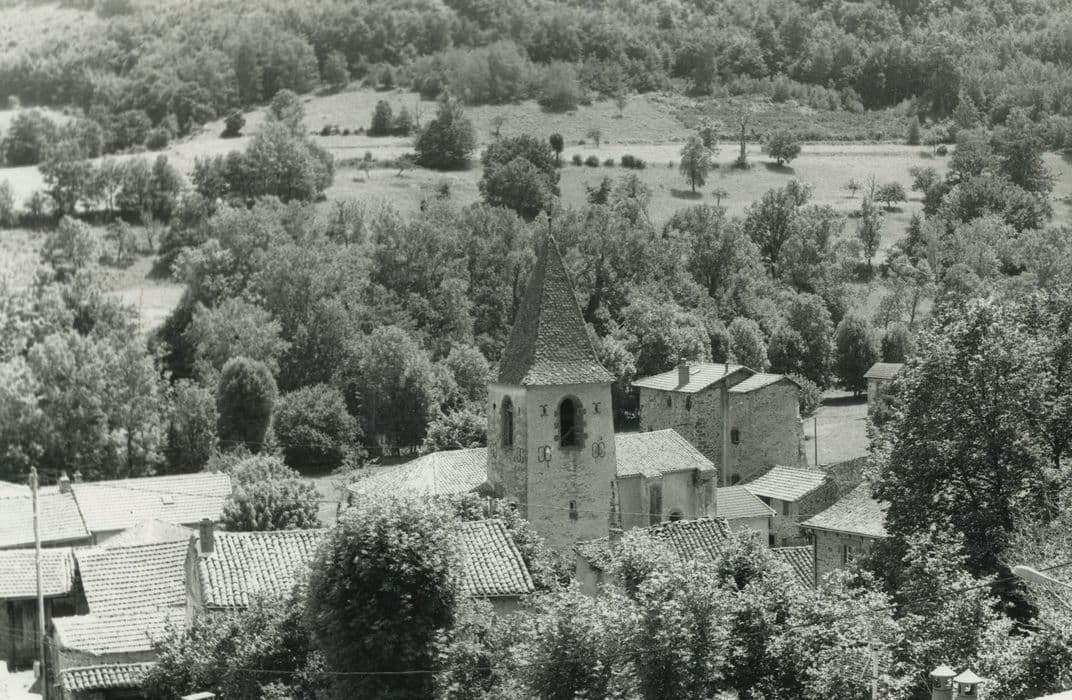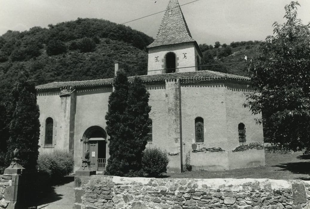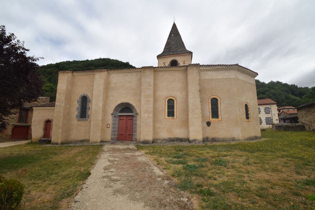 Eglise mentionnée en 944, année où elle est donnée avec ses dépendances à l'abbé de Cluny. L'église médiévale, dont seul le choeur subsiste (stylistiquement proche du 13e siècle) , comportait un clocher élevé à l'aplomb de la travée droite précédant l'abside du choeur. Abattu à la Révolution, il fut reconstruit à son emplacement actuel, en 1830 ou 1868 selon les sources. La nef est reconstruite de 1911 à 1920, sur les plans de l'architecte Serres. La nef se compose de deux travées séparées par un doubleau. Dans l'axe de chaque travée, établissement des ouvertures conformes à celles du choeur. La sacristie est construite en prolongement de la nef, contre le pignon ouest, éclairée par une baie géminée au sud et desservie à l'extérieur par une porte donnant sur la cour du presbytère. L'abside est polygonale à trois pans. Nef unique à trois travées. Clocher à trois niveaux : chapelle, pièce haute et beffroi. La voûte du choeur est entièrement peinte de frises et panneaux restituant une structure imaginaire d'ogives et de doubleaux, et personnages en médaillon.