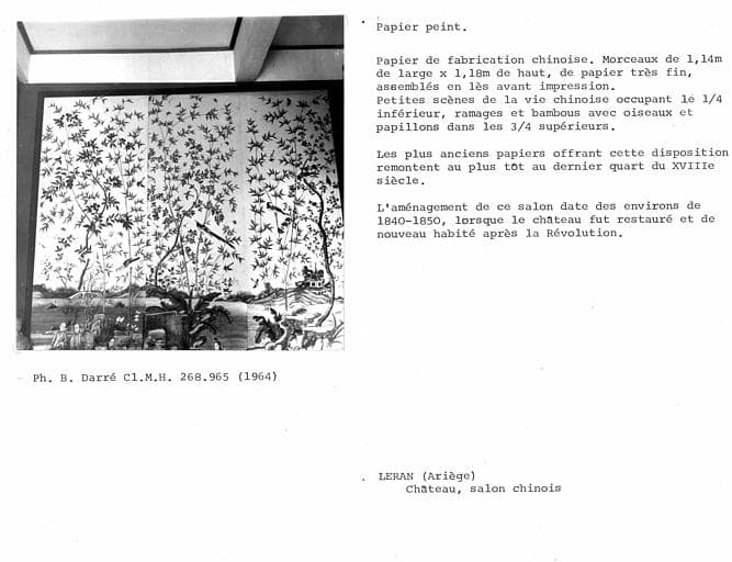 Léran fut, à l'origine, une forteresse bâtie au 13e siècle, composée de trois tours épousant les irrégularités du sol. Ce fut un poste de défense placé à proximité du château de Montségur, dernier réduit de l'armée albigeoise. Son histoire est liée aux luttes de la croisade des Albigeois, dont le seigneur de Levis fut l'un des vainqueurs. Il devint la résidence d'une branche cadette de cette famille et ne participa plus qu'à des conflits locaux. De l'ancien château, les maçonneries existent encore, en grande partie englobées et refondues dans des constructions postérieures s'étendant du 15e au 19e siècle. Les fantaisies médiévales ajoutées au 19e siècle étouffent l'authenticité de la construction. Un escalier du 17e et une tour du 14e subsistent à l'intérieur du château. Les aménagements intérieurs du 19e siècle ont détruit la plupart des aménagements antérieurs. Les murs de la chapelle ont été revêtus de boiseries Louis XV, de style italianisant, provenant du château de Lagarde, tombé en ruines à la Révolution.