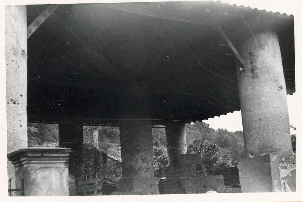 La halle était bâtie sur plan carré. Neuf gros piliers ronds à base cubique, réalisés en maçonnerie de moellons enduite, supportaient une charpente, laquelle supportait la couverture en tuile canal.