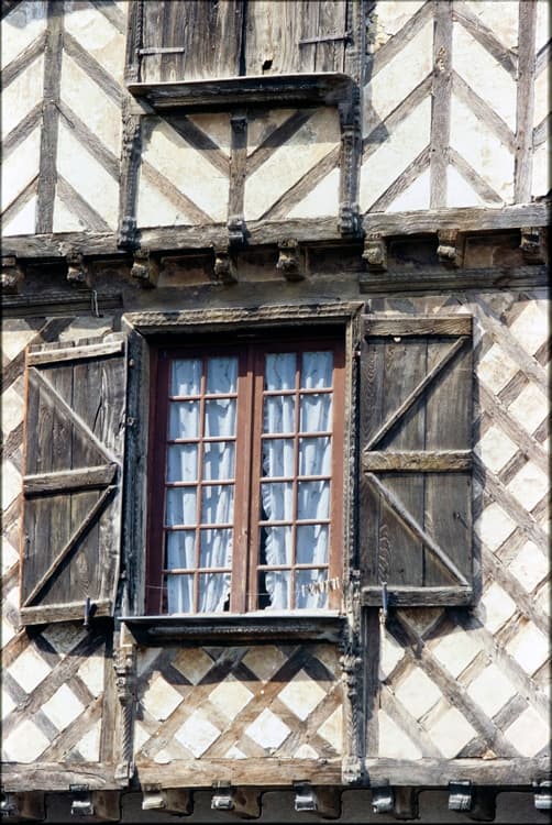 Maison à pans de bois, avec remplissage en briques ou torchis. Les exemples de pans de bois disposés en quadrillages ne sont pas très communs. L'encadrement de la fenêtre est conservé avec sa mouluration ; seul le meneau a disparu.