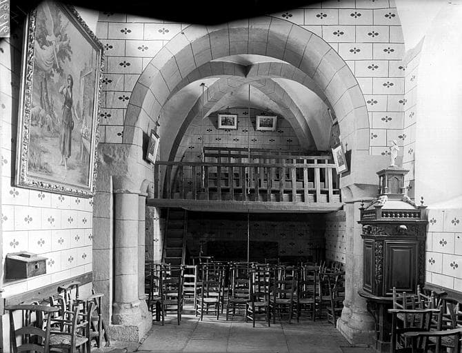 Du prieuré roman ne restent plus que les deux étages bas du clocher. Les constructions furent ruinées par les Anglais ou les Routiers et, à la fin du 16e siècle, l'église fut reconstruite, ainsi que des bâtiments au nord et le dernier étage du clocher. les deux avant-corps qui épaulent le clocher au nord et au sud, contiennent chacun un escalier à volées droites contournant un massif d'échiffre. Chacun d'eux donne accès au premier étage qui comprend une travée centrale autrefois couverte par une coupole octogone dont il ne reste plus que les trompes et deux bas-cpôtés voûtés. Les chapiteaux historiés s'ornent d'entrelacs, tresses et figurations. Ce premier étage a conservé intactes ses 21 colonnettes. Le corps de logis qui contenait le dortoir et s'appuyait sur la face occidentale du clocher fut définitivement dérasé.