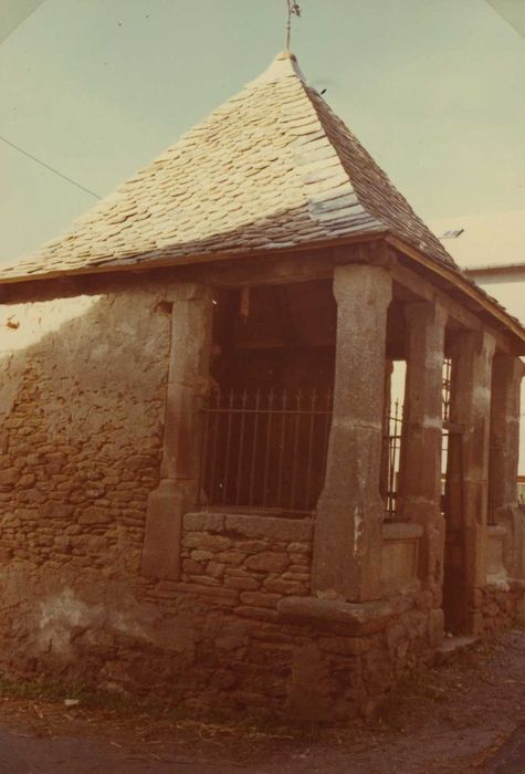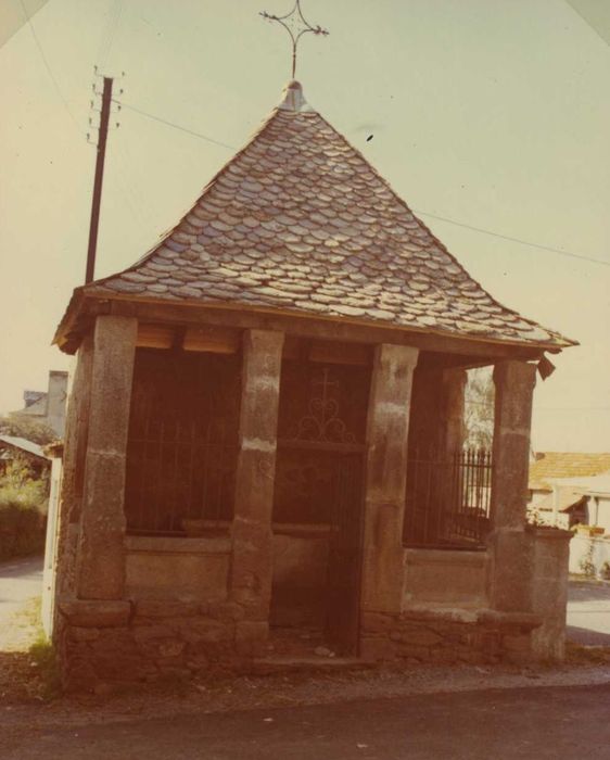 Petit oratoire fait d'une toiture en ardoise portée par quatre piliers de grès.
