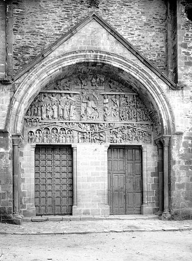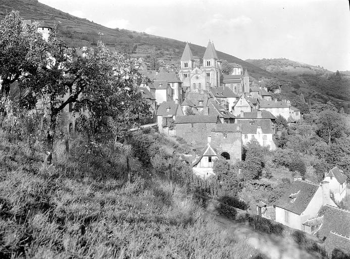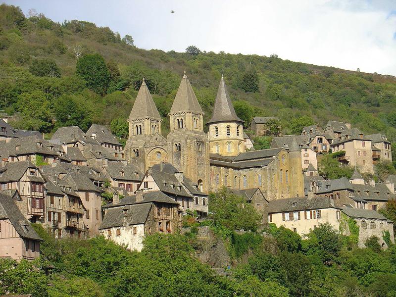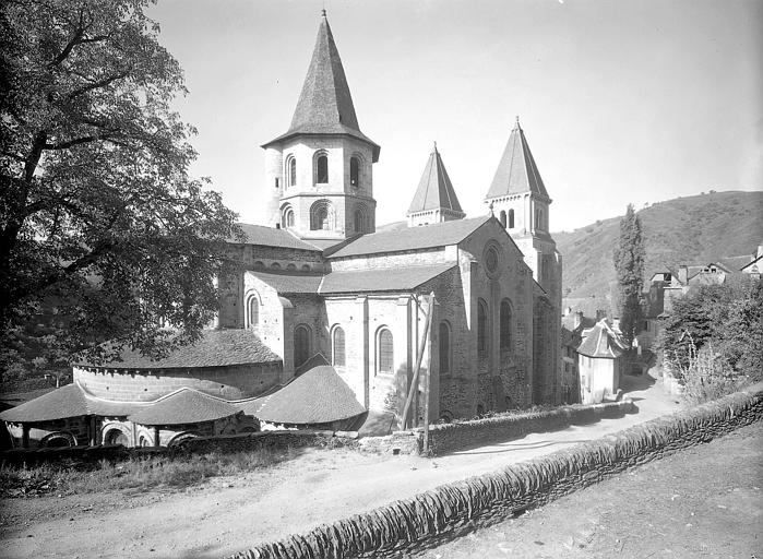 Abbaye bénédictine fondée par l'ermite Dadon à la fin du 8e siècle. Rivale de l'abbaye Saint-Sauveur de Figeac, Conques s'empara des reliques de sainte Foy, originaire d'Agen. Construction de la première église au 10e siècle. Au début du 11e siècle, Bernard, écolâtre d'Angers, écrit le récit des miracles de sainte Foy et Conques devient une halte sur le chemin de Compostelle. Construction de l'église actuelle et du cloître au 11e siècle. Tympan achevé au 12e siècle. En 1537, les chanoines succèdent aux bénédictins. En 1568, l'abbaye est ravagée par les Calvinistes. En 1830, l'architecte Boissonnade démolit le cloître. En 1873, l'évêque de Rodez restaure le culte de sainte Foy et introduit les Prémontrés.