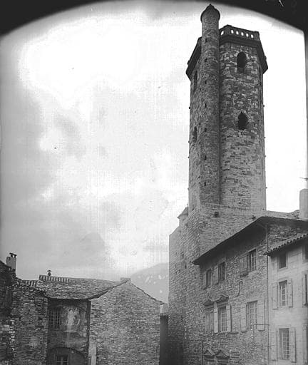 Le beffroi se compose d'une tour carrée massive remontant au 11e siècle, surmontée d'une tour octogonale édifiée en 1614. La partie romane comporte trois salles superposées, voûtées en berceau. L'accès se fait directement de l'extérieur à la salle haute, pour redescendre ensuite dans les salles inférieures. Le sommet se terminait en terrasse probablement entourée d'un crénelage avec un châtelet central octogonal. Ce châtelet fut surmonté au 17e siècle de la tour actuelle, couverte alors d'une charpente et toiture en poivrière. Cette dernière aurait été détruite par le feu en 1811, et remplacée par la terrasse actuelle.