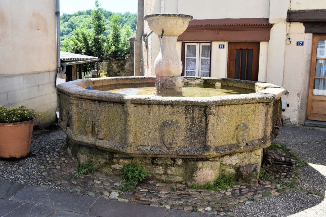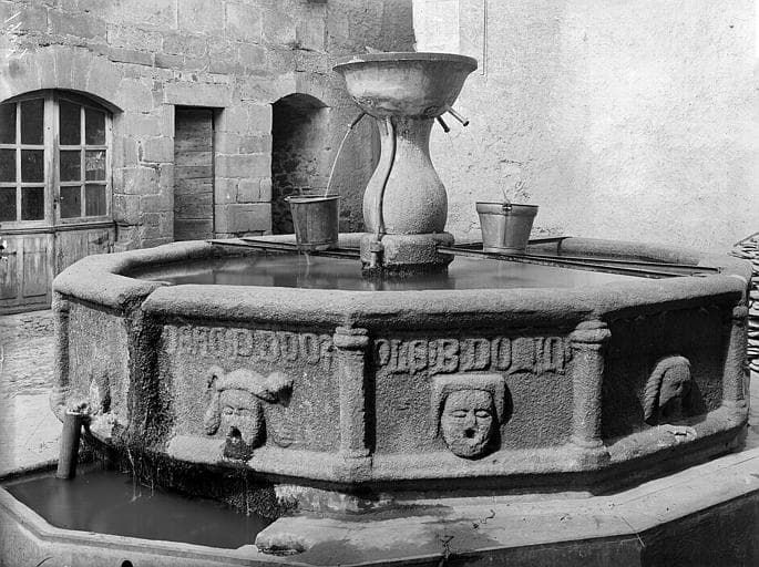 Cuve monolithe de 2, 50m de diamètre, au centre de laquelle est déposée une vasque sur un piédouche plus moderne. La cuve est polygonale. Les arêtes sont décorées de petits pilastres, et le centre de chaque face contient une tête qui, autrefois, rejetait l'eau. Tout autour est sculpté en relief une inscription en caractères gothiques, aujourd'hui illisible.