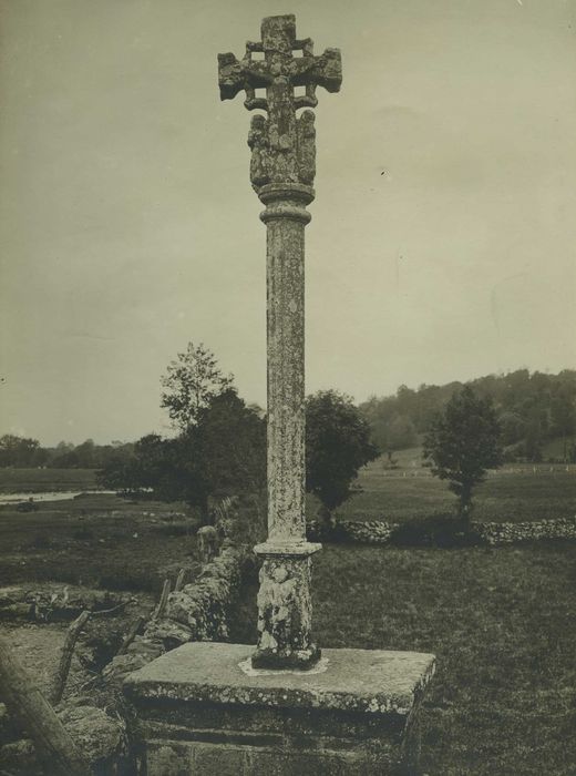 Croix en pierre avec fût en forme de colonne et piédestal, située près du pont, à l'entrée du village. Cette croix est à personnages et porte trois anges debout sur la partie du fût à section carrée. La croix semble dater du 15e siècle, et le fût de la Renaissance.