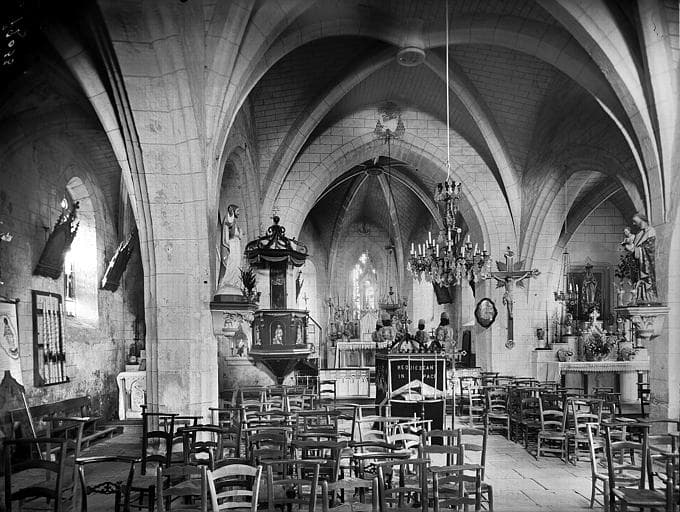 Eglise comprenant une nef de trois travées accompagnée de bas-côtés et terminée par un choeur polygonal avec abside à trois pans. Le porche voûté élevé au centre de la façade sud, est cantonné de jambages formant tourelles crénelées où apparaissent des têtes de personnages. Un clocher à quatre arcades abrité par un auvent en charpente s'élève sur l'arc triomphal. Il est desservi par un escalier à vis. Clocher et escalier pourraient être du 16e siècle. Les sommets des contreforts reproduisent une tourelle de château à deux étages de mâchicoulis. De fausses arcatures avec claire-voie décorent le parement et, aux créneaux, apparaissent de petits personnages casqués. Au-dessus du chemin de ronde, une dernière tourelle forme le sommet du fuseau.