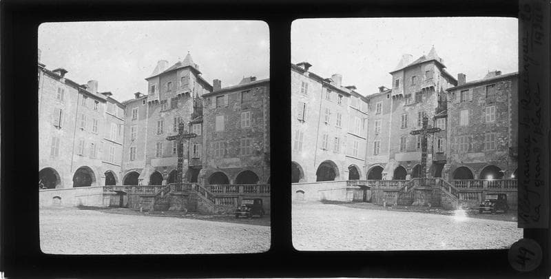 Bastide créée par Alphonse de Poitiers en 1256 en bordure de l'Aveyron. Elle devient le siège d'un archiprêtré en 1302. En 1463, la sénéchaussée du Rouergue obtient le droit de frapper monnaie royale. La bastide est une cité de riches marchands. La création de la ville se fit selon les règles fréquentes à cette époque : des rues perpendiculaires les unes aux autres, déterminaient des lots de terrains rectangulaires. Au centre de la ville, une place était réservée, ainsi qu'un terrain pour l'église sur un côté de la place. La place ne fut pas immédiatement bordée d'arcades, mais progressivement, au rythme des demandes de construction. En 1497, un incendie dévasta la place, expliquant qu'il ne reste pas de maisons antérieures au 16e siècle. Les maisons furent rebâties sur le plan primitif. Cette maison, l'une des plus intéressantes de la place, comprend un rez-de-chaussée composé d'une boutique ouvrant sur les arcades, de deux étages avec des baies à linteau arrondi et, au quatrième étage, deux échauguettes carrées portées chacune sur quatre corbeaux.