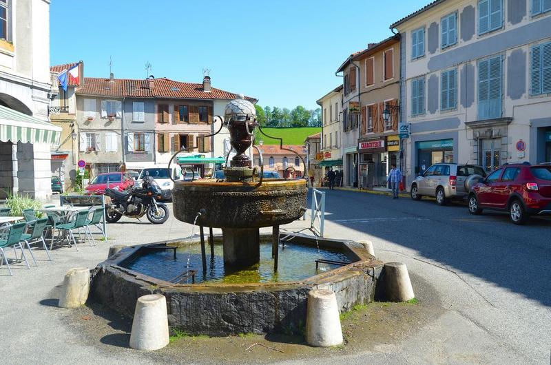 Cette fontaine aurait été offerte à la ville par Catherine de Coarraze, fin 15e début 16e siècle, mais son architecture semble plus tardive. La fontaine comporte un bassin inférieur à pans coupé, octogonal ; un bassin supérieur, plus petit, circulaire, posé sur un pilier central en pierre. De ce deuxième bassin émerge un ornement en pot-à-feu qui pourrait dater du 17e siècle. Surmonté d'une cloche ornée d'ardoises en écaille, cet ornement est relié au bassin circulaire par quatre volutes en fer forgé entre lesquelles jaillissent de fins jets d'eau.