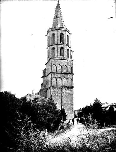 Clocher en pierre bâti sur plan carré à la base. Le rez-de-chaussée est voûté sur croisée d'ogives et forme porche. Au-dessus, deux étages ornés extérieurement d'arcades aveugles. Les bases de ces arcades reposent sur des bandeaux indiquant la séparation entre les étages. Des colonnes amortissent les angles au-dessus du deuxième étage. La construction du plan carré passe à l'octogone. Les troisième et quatrième étages, octogonaux, sont percés de baies plein cintre. A l'angle sud-est, se trouve la tourelle contenant l'escalier en spiral, octogone de la base à l'avant-dernier étage.