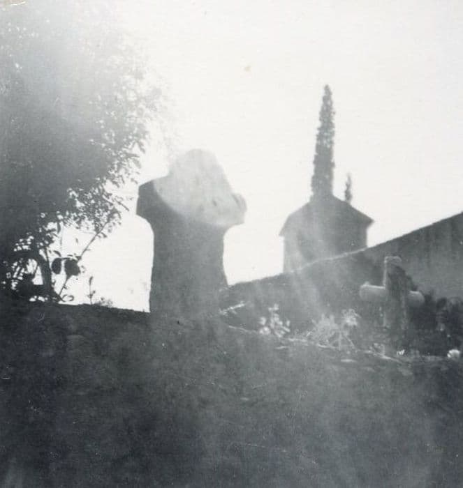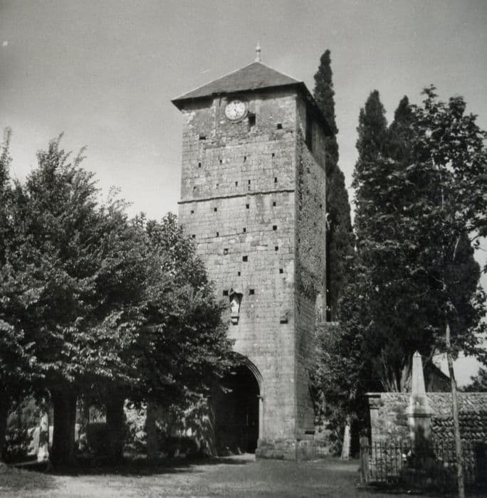 La tour carrée forme porche voûté donnant accès à l'église et au cimetière par l'intermédiaire d'une cour intérieure. Le mur entourant le cimetière est surmonté de petites croix de pierre sculptées dont quelques-unes sont datées (l'une d'elle porte la date de 1780).