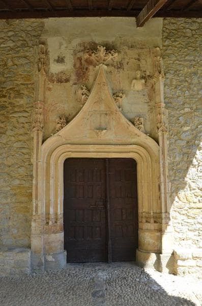 Aucun renseignement précis n'a été trouvé concernant la chapelle. Le portail est encadré de chaque côté par cinq colonnettes cannelées à bases moulurées. Trois de ces colonnettes trouvent leur couronnement dans l'arc en anse de panier qui coiffe le portail. Chacune des deux colonnettes extérieures se continue par deux pinacles dont le plus élevé se termine à la hauteur de l'extrémité supérieure du gâble. Les deux branches de l'accolade du gâble sont décorées de feuillages. Entre le gâble et le pinacle droit se trouve un buste en haut-relief représentant un personnage euphorique non vêtu.
