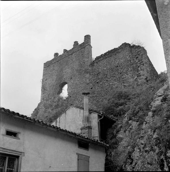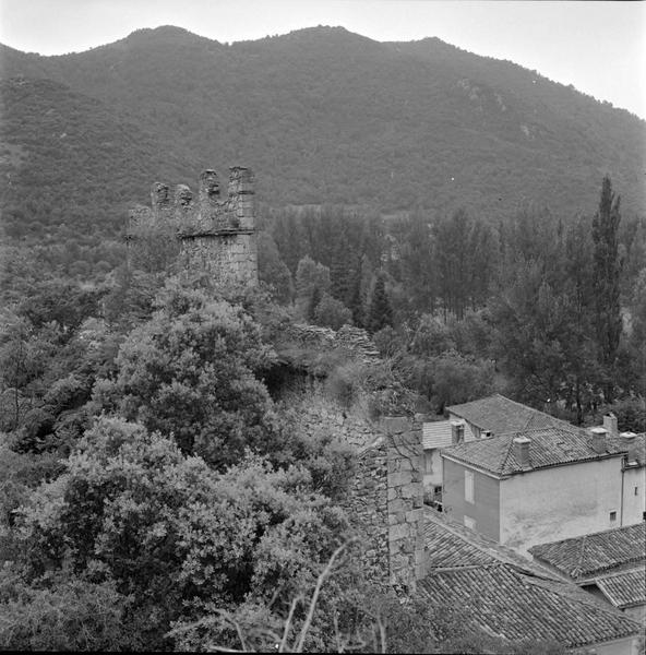 Le village faisait partie de la châtellenie de Fronsac et possédait un châtau fort. La construction de ce château semble dater de la fin du 13e ou du début du 14e siècle. Les murailles en moëllons irréguliers sont renforcées par des chaînes en blocs de granit appareillés. Des blocs de même type encadrent les meurtrières. A la partie centrale de la façade sud, un mur rectangulaire, couronné d'un crénelage, domine la courtine. La courtine sud se prolonge vers l'est pour aboutir à une poterne. Les autres côtés de l'enceinte ont dû servir de carrière pour les habitants du village. Comme la plupart des fortifications pyrénéennes de l'époque, le château ne possédait pas de tour d'angle.