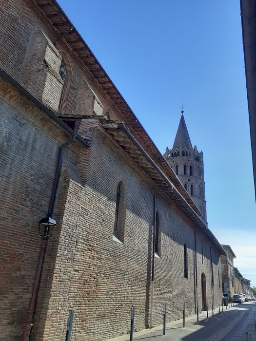La bastide de Grenade fut fondée en 1270 par les moines de Grandselves. L'église fut commencée vers1290, et le pignon oriental agrandi à la fin du 15e siècle. C'est une église en briques, voûtée sur croisées d'ogives. Les chapelles s'ouvrent entre les contreforts. Les murs sont percés de hautes fenêtres à meneau central et remplages flamboyants. Le clocher, postérieur à l'église, se présente comme une tour octogone de style toulousain, à trois étages surmontés d'une flèche. Les trois étages sont percés d'arcatures jumelles en mitres et tiers-point, le tout couronné d'une arcature de brique en mitres, entre pinacles d'angle encadrant la flèche.