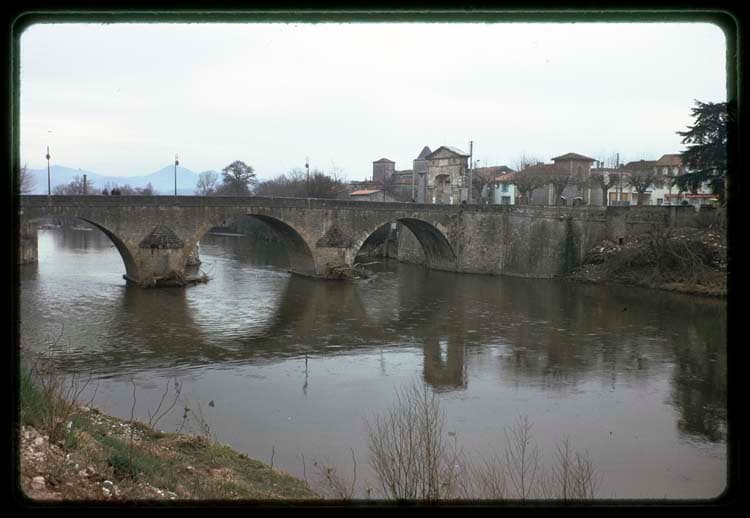 Pont en pierre à trois arches. Une porte en pierre avec fronton, donne accès au pont et à la ville. En face, une autre porte de même style est flanquée de passages pour piétons. Ces portes sont voûtées en plein cintre vers l'extérieur de la ville, et en anse de panier vers l'intérieur.