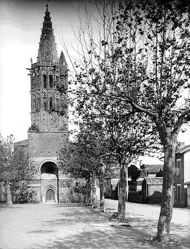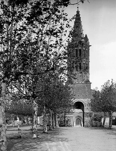 Les terres appartenaient à l'abbaye de Lezat et furent données à l'ordre de l'Hôpital entre 1120 et 1214. Une bastide y fut créée en 1257 par Alphonse de Poitiers auquel les Hospitaliers cédèrent la haute juridiction sur ce territoire. Edifice du 15e siècle, restauré au 19e, dans lequel ont été retrouvées des peintures murales du 16e. Construit en briques, il est bâti sur le plan languedocien : nef unique flanquée de six chapelles. Abside à cinq pans. Clocher-porche flanqué de la chapelle des fonds baptismaux. Sur une base carrée, il s'élève sur trois étages polygonaux dont les deux derniers sont pourvus chacun de seize baies en tiers-points à remplage, encadrées de colonnettes. Trente-deux têtes d'hommes et d'animaux séparent les étages. La partie supérieure se termine par une flèche pyramidale. A la base de cette flèche, une circulation fait le tour du clocher.