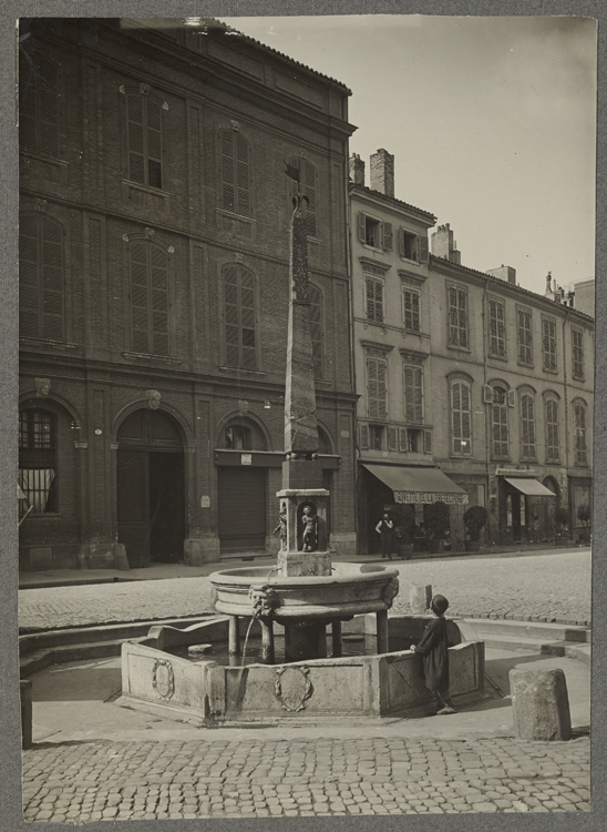 A l'origine, cette fontaine se trouvait dans les dépendances de l'église Saint-Etienne. En 1546, elle est transférée sur la place. La décoration actuelle fut disposée en 1593. L'ouvrage se composait d'une vasque de marbre sur colonne, posée par Jean Raincy. Au milieu, piédestal à quatre niches élevé par Antoine Bachelier. Sur le piédestal, quatre boules de bronze étaient surmontées d'une pyramide en marbre blanc et rouge. Dans les niches, quatre marmousets ou cupidons. A la base de la fontaine, se trouve une cuve octogonale. Restaurations en 1649 et 1720. A cette dernière date, l'ingénieur Ferrary fit tailler une nouvelle vasque, relever la pyramide sur un coussinet en briques recouvertes plus tard de plaques de fonte, reproduire en pierre la partie supérieure de la pyramide qui avait été rompue, refaire des niches en marbres, retailler la cuve octogonale et y sculpter les armoiries des capitouls de l'année, et enfin daller le parvis qui entoure la cuve.