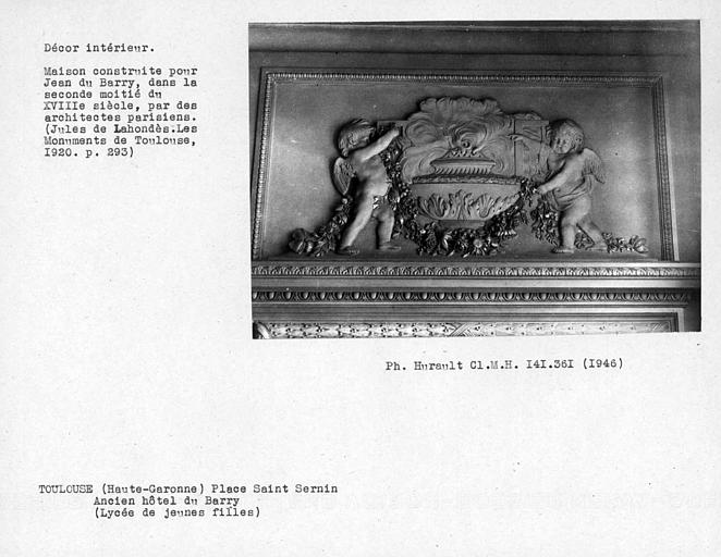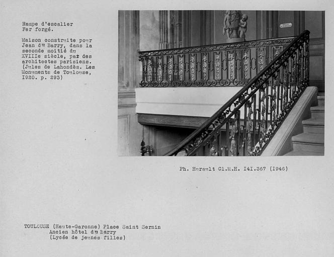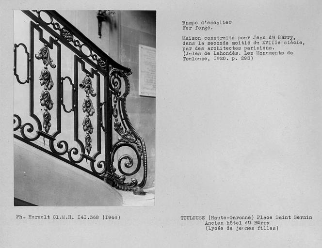 En 1774, après la mort de Louis XV, Jean du Barry est disgracié et exilé à Paris. Puis, il obtient son pardon et rentre à Toulouse où, en 1776, il achète immeubles et terrains donnant sur la place Saint-Raymond. En 1777, il entreprend la construction de l'hôtel auquel il veut donner un lustre comparable à celui de Versailles. En 1794, après la mort du propriétaire, le mobilier est vendu comme bien national et l'hôtel loué. En 1817, les Bénédictins s'y installent et transforment l'édifice. En 1905, il est rattaché au lycée de jeunes filles. Durant la Première guerre mondiale, un hôpital militaire y est installé. L'ensemble présente trois constructions différentes. A droite, l'hôtel présente sept fenêtres sur une façade décorée. Au centre, la "maison du Barry", ancien immeuble du 17e siècle raccroché à l'hôtel. Enfin, à gauche, une dernière travée construite par Du Barry avec, au premier étage, une grande fenêtre vénitienne. A l'intérieur, les pièces présentent un décor utilisant stuc, peinture, dorure et ferronnerie.