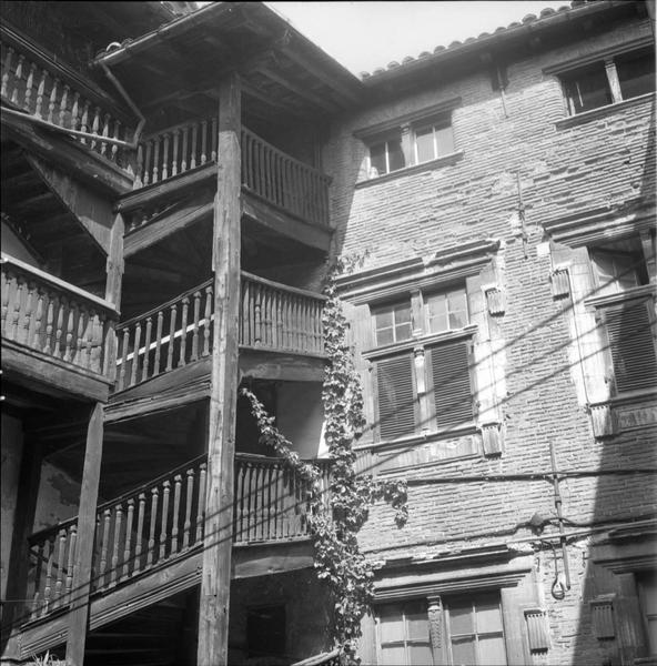 Les maisons de bois, nombreuses au Moyen-Age, ont disparu soit détruites par l'incendie, soit remplacées par des bâtisses plus luxueuses. Cette maison a été construite dans les dernières années du 16e siècle, par Guillaume de Saint-Germain, capitoul en 1589. La cour présente trois étages de galeries bordées de balustres de bois. Deux escaliers à limons droits, portant des balustres semblables à ceux des galeries, se montrent aux angles, en diagonale de la cour. Sculptures des fenêtres aux deux étages traditionnels de colonnettes. L'encadrement supérieur s'appuie sur des pilastres. Les sculptures des portes s'ornent du monogramme du Christ dans des cartouches entourés de fleurons.