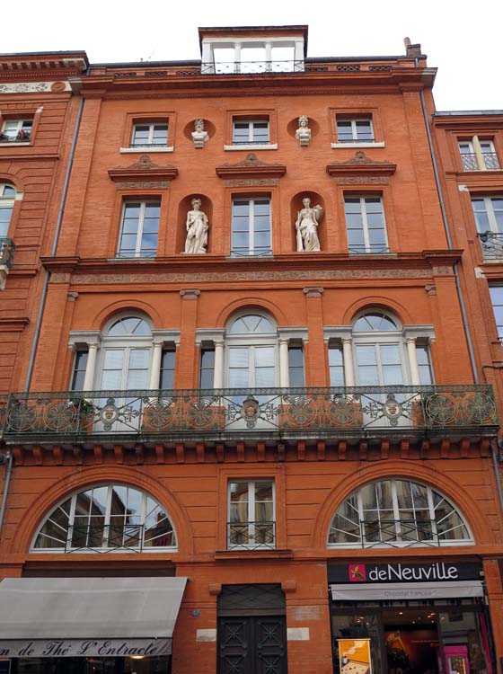 Un immeuble existait déjà à cet emplacement au début du 15e siècle, appartenant à Simon Plasensac, capitoul en 1533. Par la suite, l'immeuble appartient à plusieurs capitouls. La façade a probablement été reconstruite vers 1830 par Urbain Vitry, en même temps que la fontaine. Au premier étage, trois fenêtres plein cintre, colonnes engagées, pilastres de hauteur d'étage portant entablement avec frise décorative en terre cuite (animaux, rinceaux). Balcon à croix de Saint-André, palmettes, effigies, rosaces. Au deuxième étage, trois fenêtres à plates bandes avec frises et corniches ornées, deux grandes niches garnies de statues. Au troisième étage, fenêtres carrées et deux niches rondes avec bustes. De grand pilastres encadrent cette composition et portent la corniche supérieure, surmontée d'une balustrade méridionale et d'un attique partiel ouvert en galerie par deux colonnes entre dans antes. Cette façade représente un bel exemple de style Empire.
