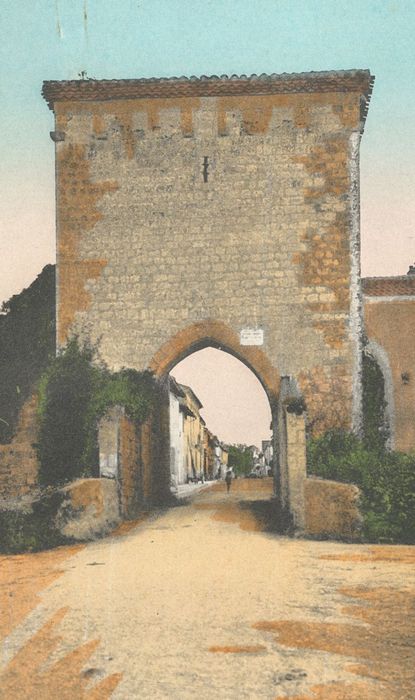 Ancienne tour barlongue qui franchit la rue principale et livre passage par une baie en tiers point. Elle se compose de deux murs parallèles soutenant une voûte en berceau brisé. Au-dessus de cette voûte se trouve une petite salle où se tenaient les défenseurs, le corps de garde. A la partie haute, se devinent les traces d'anciens mâchicoulis. Les murs d'enceinte ont disparu mais le pont précédant la tour subsiste, enjambant ce qui était le fossé.