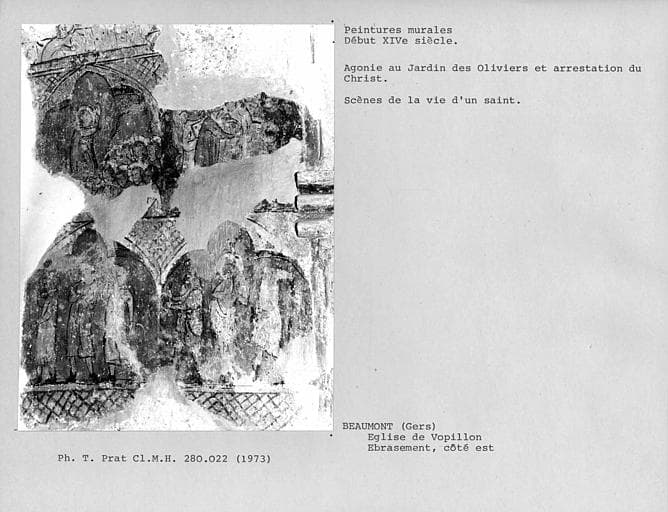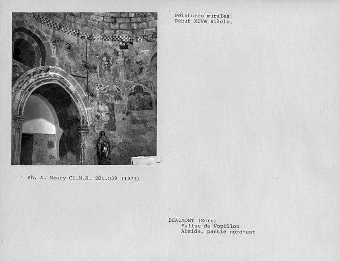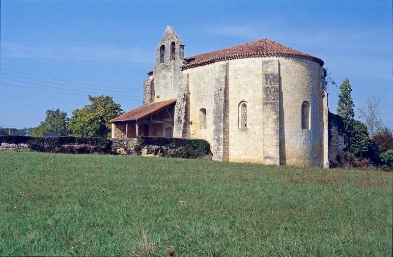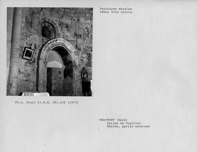 Eglise de style roman construite, dans sa majeure partie, par l'ordre de Fontevrault. La construction est due au sire Arnaud de Vopillon, qui finança l'église et le prieuré, vers 1140, à la suite d'un pélerinage qu'il fit au Paravis, près de Port-Sainte-Marie. En 1569, l'édifice a été en grande partie ruiné par les protestants conduits par Montgomery. C'est sans doute à cette époque que la voûte s'est écroulée et qu'une partie de la nef (côté ouest) a été détruite. Au 18e siècle, le porche a été refait au midi (1774). C'est un édifice à nef unique avec abside semi-circulaire, et qui était autrefois voûté. Un damier cerne à hauteur des chapiteaux, l'ensemble du choeur et de la nef. Les chapiteaux portent sur des colonnes engagées et ceux du choeur s'ornent d'un décor végétal plat. Ceux de la nef représentent sans doute Daniel entre les lions. Peintures murales du 13e siècle, ornant l'intrados de l'arc de la porte conduisant à la sacristie, le mur nord du choeur de l'église. Le monastère de Vopillon a régné dans le Condomois pendant plus de quatre siècles. La Révolution transforme l'église en grange après avoir détruit le prieuré.