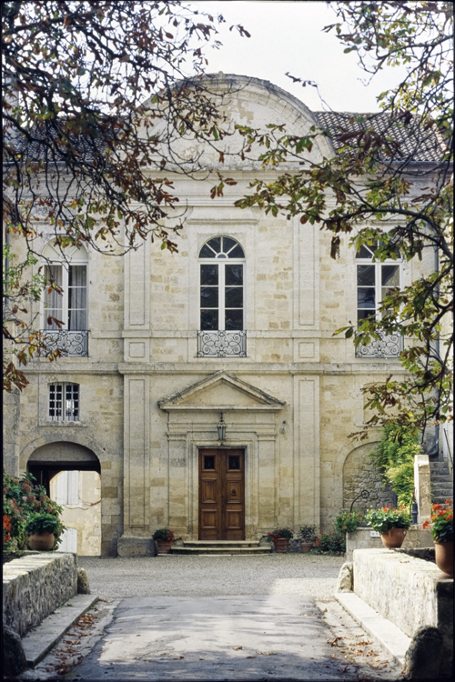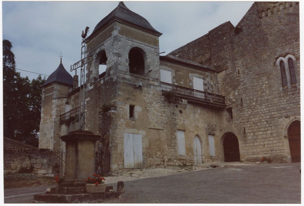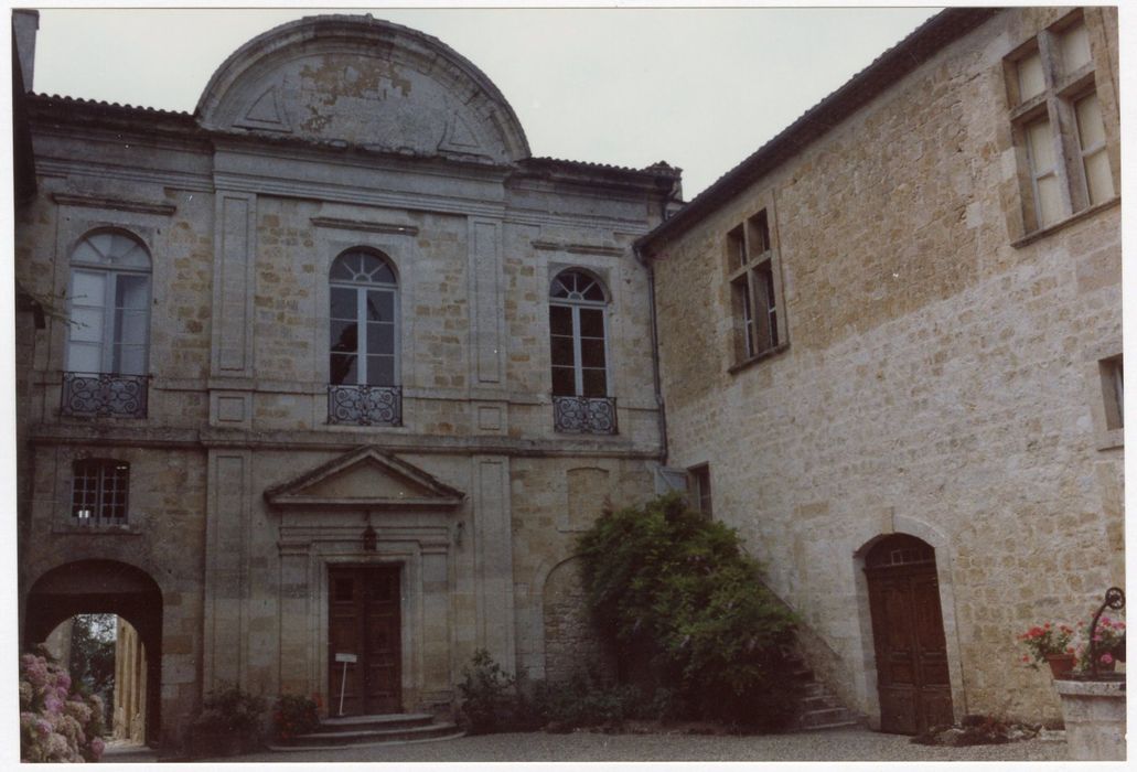 Le château a été construit par l'abbé de Condom, Montassieu de Galard, au 13e siècle. En 1567, Blaise de Monluc y apporte de nombreuses améliorations. Au début du 18e siècle, Monseigneur de Milon opère d'importantes modifications dans le goût classique. L'édifice est disposé sur deux ailes perpendiculaires formant une cour bordée, sur son troisième côté, par l'église. L'accès de fait par un pont enjambant le fossé. La partie la plus ancienne est l'aile nord qui conserve les murs de l'ancien château médiéval. L'aile nord se compose, au rez-de-chaussée, de petites salles desservies par un couloir, aboutissant aux cuisines recouvertes d'une coupole de briques posées de champ. Un escalier à vis, sur le côté, mène à la terrasse supérieure aménagée au 19e siècle. La travée axiale de la façade d'entrée est surmontée d'un fronton curviligne. Deux pilastres plats cantonnent la porte d'entrée, décorée d'un fronton triangulaire. Deux baies en anse de panier flanquent la porte d'entrée. A l'ouest, la façade est flanquée de deux tours. Une galerie munie d'un balcon en fer court le long de cette façade, ainsi que la façade méridionale où s'ouvre le chai. A l'intérieur, une vaste cage d'escalier dessert le château. Au sud du château, dans le prolongement de l'église, trois arcades en anse de panier servent de porche à des communs.