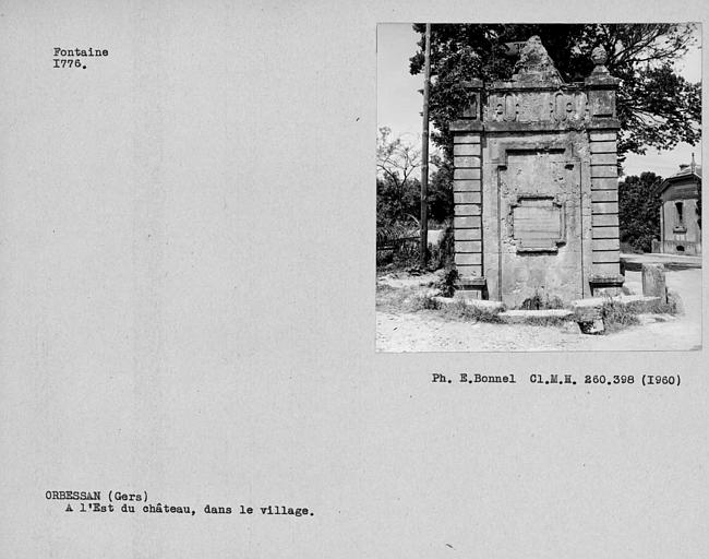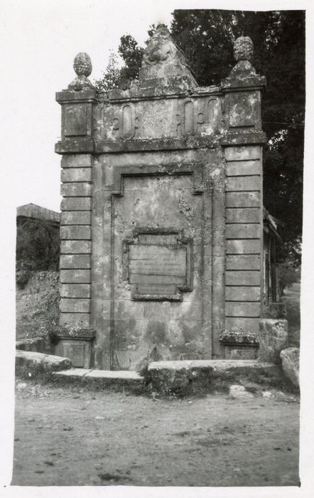 Fontaine offerte au village par le chevalier de Bourg. Deux pilastres encadrent une partie centrale où se trouve l'inscription de donation, dans une moulure en boudin. Un entablement surmonte l'ensemble. Un bassin semi hexagonal se trouve devant.