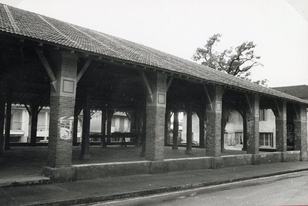 Selon la tradition locale, la halle daterait du 16e siècle, mais elle est caractéristique d'une ville neuve du Moyen-Age. Elle présente le jumelage entre la halle et la place à cornières, parti destiné à favoriser les transactions commerciales. La halle fait également fonction d'emban par rapport à l'église. Deux piliers sont adossés à l'église. Ceux du pourtour sont en brique. Primitivement, ces piliers étaient en bois. A l'intérieur, les poteaux de bois comportent des chapiteaux sculptés. L'allée centrale monte plus haut que les allées latérales.