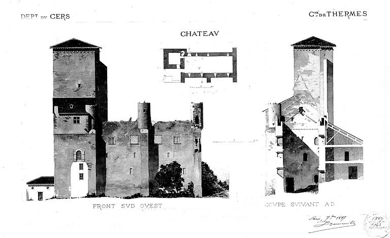 Le château dépendait du comté d'Armagnac et appartenait à ses vasseaux, les seigneurs de Termes d'Armagnac. L'un d'eux combatit aux côtés de Jeanne d'Arc. Les vestiges comprennent un donjon carré auquel est accolée une tour rectangulaire. Donjon constitué par quatre murs de deux mètres d'épaisseur, avec trois étages de salles voûtées en berceau brisé. Chaque salle est éclairée par des fenêtres à meneaux, et garnie d'une cheminée. Les étages sont desservis par un escalier sur plan circulaire, en pierre. Latrines et galeries de communication. Le sommet de la tour se termine par une charpente. Au sud se trouve un corps de bâtiment plus bas, non voûté. A la base de ce bâtiment, deux grands arcs ont été murés. A l'est, un grand mur prolongeant l'une des faces du donjon, est le reste d'un corps de logis. Les alentours conservent des traces d'autres constructions.