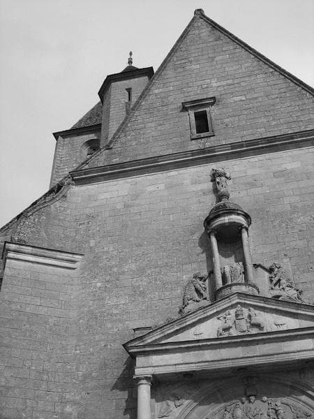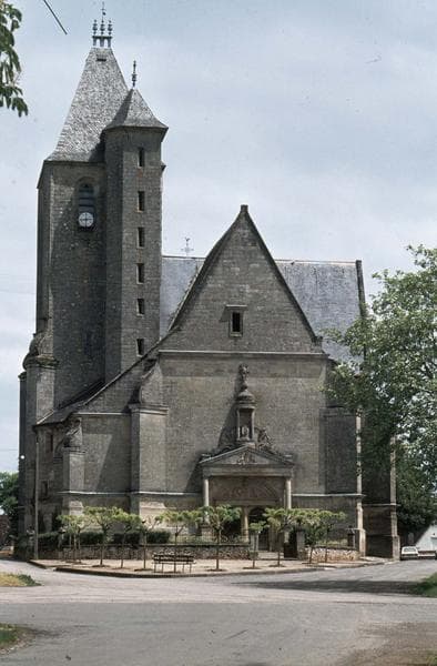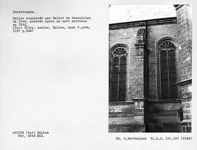 Eglise commencée en 1540, composée d'une nef de deux travées, d'un transept, d'une abside à cinq pans précédée d'une travée barlongue. La balustrade à colonnes et entablements doriques qui ferme la chapelle du tombeau est datée de 1649. Dans la nef, les nervures des voûtes retombent sur des chapiteaux doriques surmontant des pilastres à la base épannelée. Surmontant le croisillon nord du transept, le clocher est flanqué d'une tourelle d'escalier octogonale. La décoration extérieure, à l'exception du portail ouest et d'une niche contenant autrefois une statue de la Vierge sur le côté sud, ne présente aucun caractère religieux. La frise continue qui fait le tour de l'église, illustre la vie du commanditaire, Galiot de Genouillac.