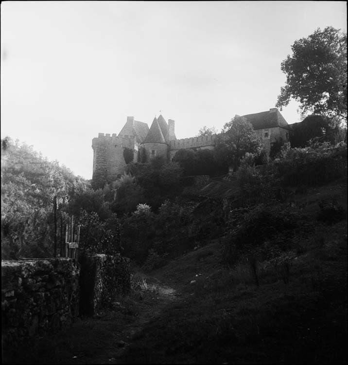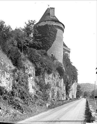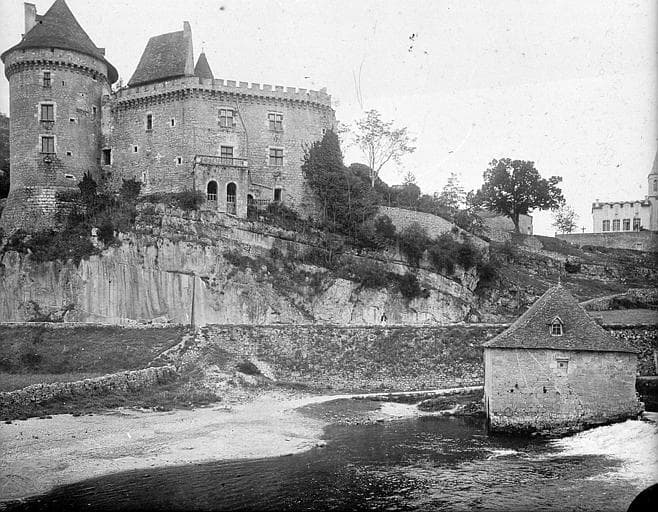 Château édifié dans les vingt premières années du 16e siècle. Construction inachevée du fait des guerres de religion. L'aile Est est continuée au 17e siècle (avec terrasse à balustres et charpente en carène). Cette dernière construction a bénéficié de démolitions de constructions antérieures. Au sud, le réseau de caves creusées dans le roc et la tour constituent la première construction défensive. La grosse tour sud est le point de jonction des deux ailes en V, qui constituent le plan du château. La deuxième tour ronde, à l'angle nord-ouest, est dotée d'un escalier dans l'épaisseur du mur. Aux deux-tiers de la façade ouest, une limite dans l'appareil atteste l'existence de deux campagnes de travaux différentes. Cette façade conserve des fenêtres moulurées des 15e-16e siècles, celles du nord datant du 17e siècle. Les deux tours devaient être réunies par une courtine et un chemin de ronde. Une terrasse à balustres sur arcades a été plaquée sur l'aile Est au 17e siècle. Dans l'aile ouest, les salles conservent plusieurs cheminées monumentales des 16e et 17e siècles. Dans la salle à manger se trouvent deux toiles peintes du 17e siècle, illustrant des thèmes du 16e : chasse au faucon et chasse à courre.