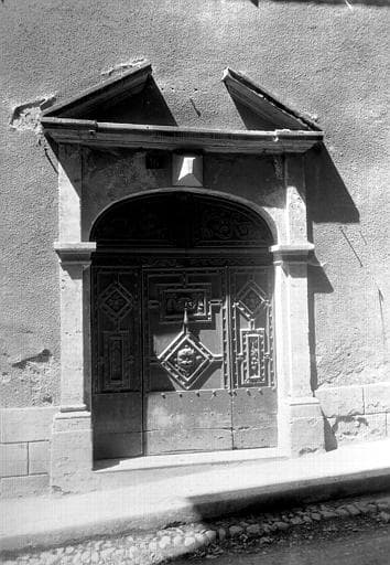 Porte ouvrant en trois parties, avec imposte. Fond constitué par de larges plateaux de noyer, sur lesquels sont fixés, au moyen de gros clous à tête ronde, des moulures qui dessinent des panneaux carrés et rectangulaires. A l'intérieur de ces panneaux, motifs de sculpture. Les panneaux d'imposte et la traverse sont décorés de rinceaux sculptés.