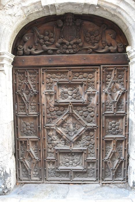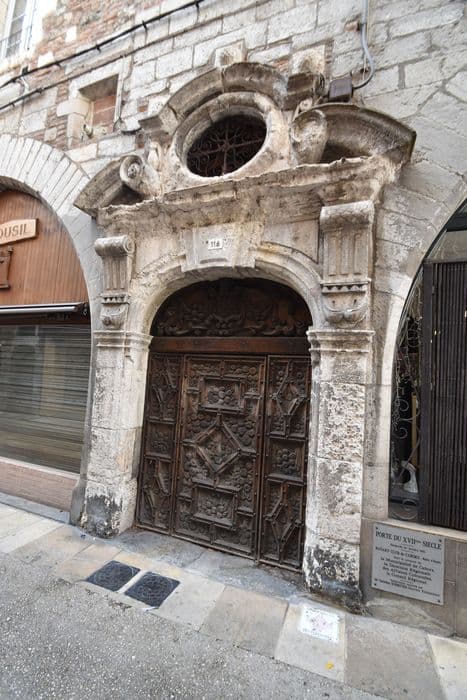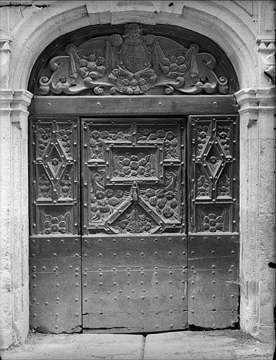 Cette porte est un beau specimen de menuiserie régionale du 17e siècle. Les panneaux, tous sculptés, sont encadrés de moulures fixées sur le fond, au moyen de gros clous à tête ronde. Un marteau en fer est fixé au-dessus du panneau central. Au centre du motif sculpté de l'imposte, on remarque un écusson armorié d'une tête de lion.