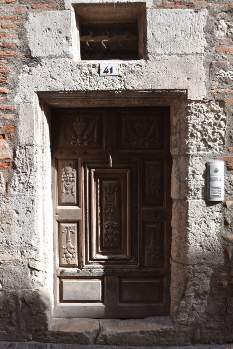 Cette porte comportait primitivement huit panneaux à petit cadre, encadrant un panneau central plus important, à grand cadre. Les deux panneaux inférieurs, dégradés par les intempéries, sont masqués par une plinthe en lambris d'assemblage, avec deux panneaux à table saillante. Les sept panneaux qui subsistent sont décorés de sculptures représentant des fruits ou des masques et des feuillages stylisés. Un marteau en fer forgé est fixé au-dessus du panneau central.
