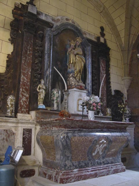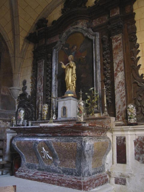 Eglise du 12e siècle se composant primitivement de la nef et d'un choeur en hémicycle. Les deux chapelles latérales formant transept ont été ajoutées au 15e siècle. Les voûtes de la nef et du choeur ont été reconstruites au 15e siècle, en remplacement des anciennes voûtes romanes. Le doubleau de la deuxième travée de la nef retombe sur des chapiteaux romans sculptés. La façade ouest est surmontée d'un pignon percé de trois baies en plein cintre, destinées à recevoir les cloches. La partie supérieure du pignon a été modifiée au 18e siècle dans le goût de l'époque. Entre 1715 et 1750, les murs du choeur et des deux anciennes chapelles nord et sud, ont été recouverts de marbres de couleur et les murs des chapelles de peintures décoratives encadrées dans les marbres.