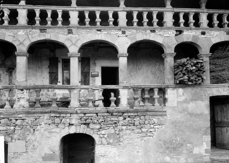 Maison de cultivateurs, accompagnée de divers bâtiments d'exploitation (deux granges, un hangar, une cazelle à usage de poulailler). La maison est bâtie en moëllons et pierre du pays. Elle paraît avoir été construite en deux étapes. Primitivement et jusque vers la fin du 18e siècle, elle ne comprenait que le corps de logis qui forme, au premier étage, la salle-cuisine, avec perron d'accès au sud, et un cabinet en encorbellement au nord. Plus tard ont été ajoutées les deux salles à l'est et à l'ouest, avec les deux chambres formant avant-corps, surmontées de pigeonniers, ainsi que la galerie à deux étages reliant ces avant-corps.