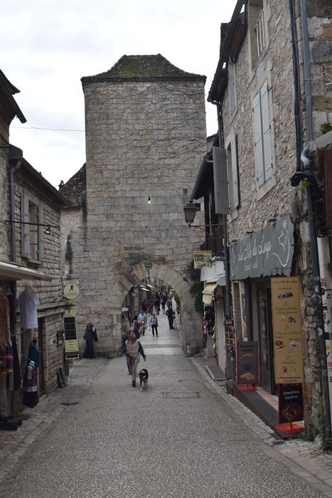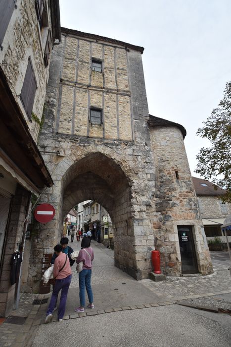 Cette porte, composée de deux étages, comporte une tourelle d'escalier.