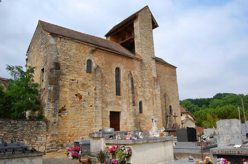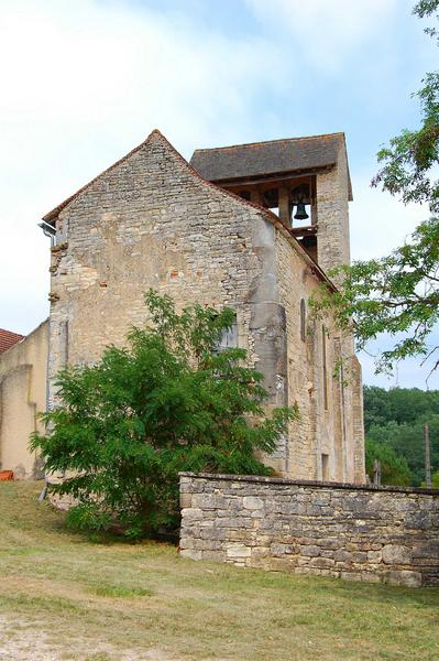 Ancienne chapelle castrale (château attesté au 14e siècle) , l'église est un petit édifice rural comportant une nef à deux travées, un chevet plat et une chapelle latérale. Les voûtes sont en plâtre sur lattis en bois et reposent sur quelques culots sculptés de têtes. Un clocher-mur à trois baies surmonte la deuxième travée. A l'intérieur, peintures murales du 16e siècle représentant : Adam et Eve ; la fuite en Egypte ; des soldats et un homme coupant du blé ; une scène de chasse au faucon. Des entrelacs décoratifs sont peints sous l'arc doubleau de l'abside et sur le mur du fond au niveau de la tribune. Le château était accolé au mur ouest, percé d'une ouverture en hauteur permettant l'accès à la tribune.