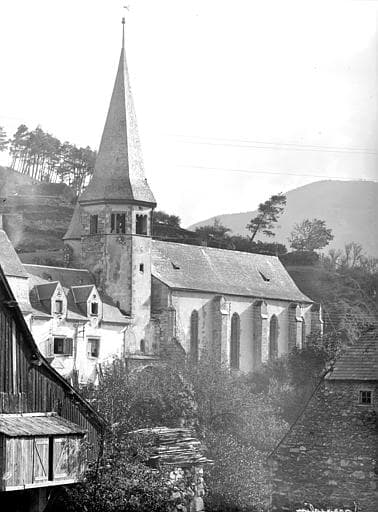 Cet édifice a certainement remplacé une chapelle plus ancienne et aurait été placé à l'endroit où le saint aurait vu le jour. Les assemblées générales des enclaves d'Aure se tenaient habituellement dans cette chapelle. Les archives des quatre vallées y étaient conservées. Désaffectée sous la Révolution, l'église fut convertie en magasin de l'hôpital militaire bâti à côté pour le service des troupes cantonnées dans la vallée afin de défendre la frontière. Elle est rendue au culte en 1857 et des travaux de restauration sont alors réalisés par l'architecte Laurent Barthe. ££Précédée d'un narthex, la chapelle se compose d'une nef étroite, orientée, se terminant à l'est par un sanctuaire à trois pans. Le narthex est la partie la plus ancienne, s'ouvrant par une porte romane du 12e siècle à six colonnes surmontées de chapiteaux historiés. Le tympan est orné d'un chrisme. Un escalier en pierre adossé au mur nord du narthex, conduit à la porte d'entrée de la tourelle ronde contenant l'escalier à vis montant au beffroi. Le clocher surmonte le narthex, rectangulaire en bas, octogonal au sommet. Son mur nord s'élève en encorbellement, porté par un berceau plein cintre. Une grille de fer du 16e siècle sépare le narthex de la chapelle, reposant sur un bahut en pierre au centre duquel est aménagé l'emplacement d'une porte. Cette grille est formée de barreaux fuselés en fer, encadrés entre des pilastres ornés de chapiteaux et de frises en fer décorés, dans le style de la Renaissance. Le vaisseau de la nef est couvert par une voûte en croisée d'ogive, avec adjonction de liernes et de tiercerons. Dans l'axe de la seconde travée fut ajoutée une chapelle dédiée à la Vierge. La sacristie fut bâtie en 1671.