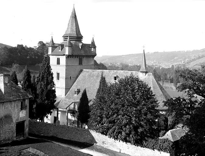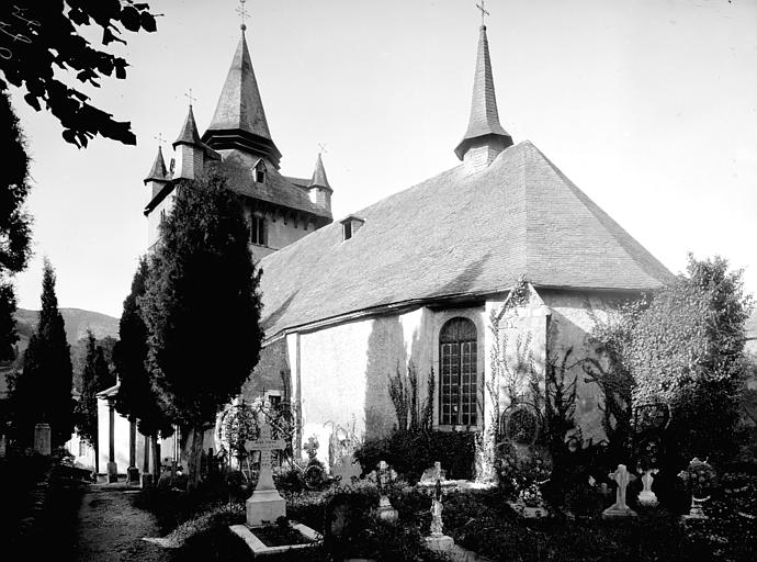 De l'église du 16e siècle se distingue l'imposante tour barlongue et son clocher-forteresse qui, avec ses contreforts d'angle, sa flèche, ses quatre clochetons polygonaux et ses baies est l'un des plus typiques de cette vallée. Il couvre tout le fond de la nef, terminée par un chevet à pans coupés. Construction de la voûte à bardeaux de bois peints et clés pendantes, en 1776. Sacristie et lambris en 1777.