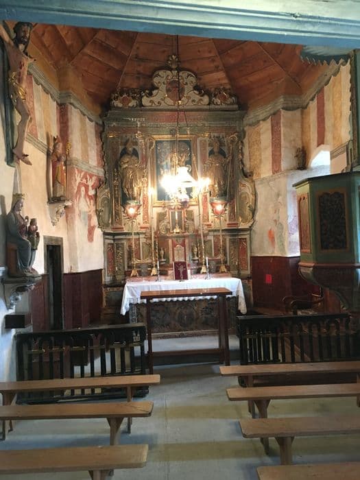 Petite église romane à clocher-pignon augmentée au 16e siècle par une chapelle gothique et un portail d'entrée. Elle est décorée de peintures murales superposées des 13e et 16e siècles.