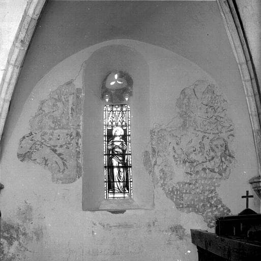 La nef se termine par un chevet polygonal. A l'ouest se dresse la tour qui couvre la tribune sous laquelle la clôture délimite un vestibule. Côté sud, une chapelle abritant les fonts baptismaux s'ouvre sur la nef. Un décor peint couvre voûtes et murs de la nef et du bas-côté. Le porche conserve la représentation des Sept péchés capitaux, représentés sous l'apparence de femmes que tentent des démons. Dans la première travée, Jugement dernier, Christ montrant ses plaies, anges de la Résurrection ; sur le mur sud, généalogie de la Vierge. La seconde travée montre la lapidation de saint Etienne ; en face sont représentés saint Sébastien, saint Antoine et deux saints évêques. La voûte est ornée des patriarches et des prophètes présentés dans des médaillons. Cette représentation se poursuivait également dans l'abside. Dans le collatéral nord sont représentés des épisodes de la Passion du Christ et, sur les voûtes, les symboles des évangélistes et les Pères de l'Eglise latine. Ce décor a été réalisé entre le 16e et le 17e siècle (1591-1592 pour le mur sud de la nef).