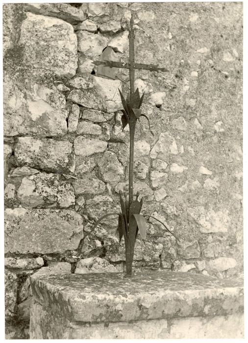 Croix en fer forgé fixée sur un socle de pierre. La hampe sort d'un bouquet de feuilles de tôle effilées, motif reproduit à mi-hauteur. Le montant s'achève en fleur de lys et le croisillon en fer de lance.