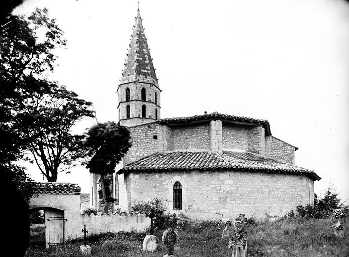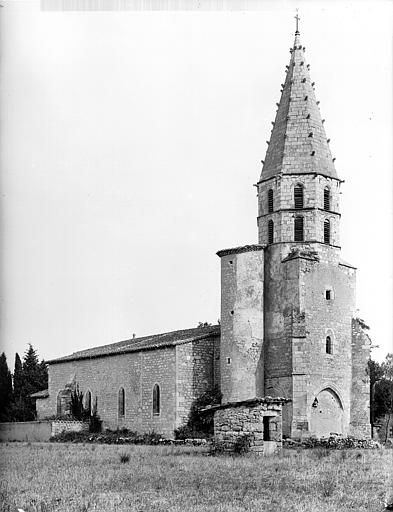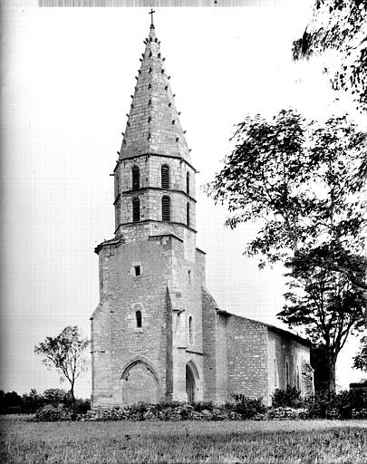 Eglise gothique à une nef avec chapelles latérales séparées par les contreforts intérieurs. Clocher octogonal à flèche très élancée, flanqué d'une tourelle contenant l'escalier à vis. Sous le clocher, porche carré servant d'entrée à l'église, formé par quatre gros piliers ronds en pierre de taille et voûté sur croisées d'ogives.