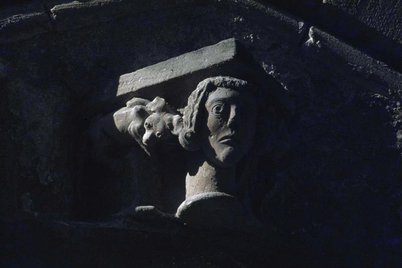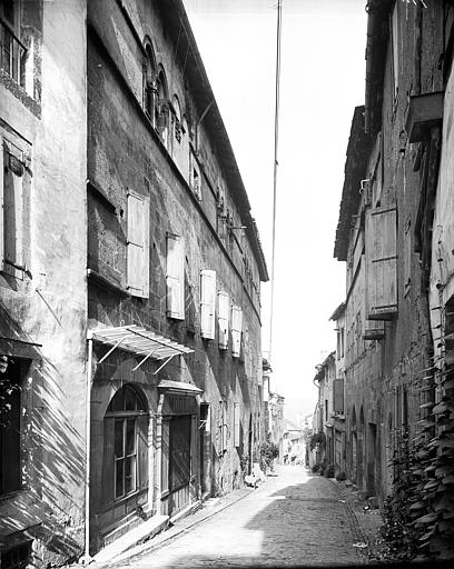 Construction en pierre de taille. Rez-de-chaussée à arcades. Ouvertures du premier étage modernisées. Au deuxième étage, deux groupes de quatre baies, par paires. Chapiteaux sculptés (feuillages, têtes humaines, animaux...).