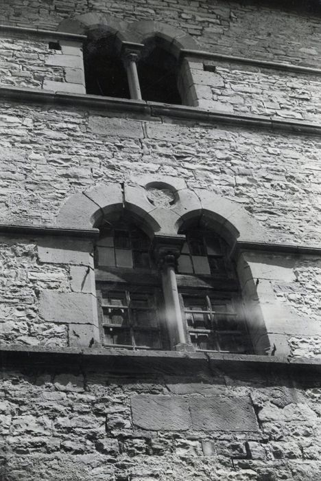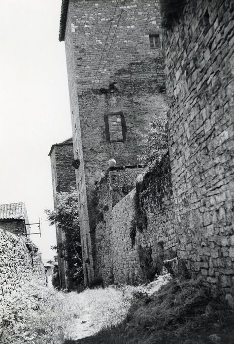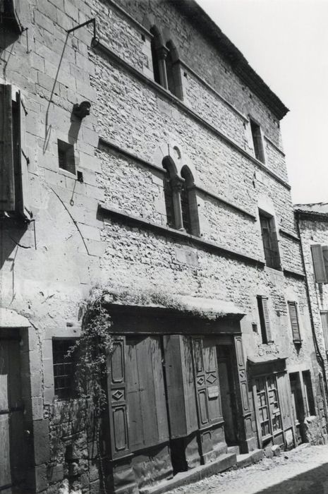 L'immeuble fait partie d'un ensemble qui s'étendait depuis la porte fortifiée jusqu'à la place de la Bride, entre les remparts nord et la Grande-Rue au sud. Il semble que, dès le 14e siècle, une série de bâtiments se soit édifiée entre ce mur et la rue principale, avec boutiques en façade (arcatures brisées au rez-de-chaussée). Cet édifice présente une façade à devanture de boutique sur la Grande Rue. En arrière, une cour intérieure en forme de trapèze, avec galerie à l'ouest au niveau du premier étage et galerie à l'est au deuxième étage. Au nord de cette cour, entre celle-ci et le rempart, un passage et un escalier en bois mènent du rez-de-chaussée au premier étage. Dans l'angle nord-est de la cour, un autre escalier, en vis, fait communiquer le premier et le second étage. Au nord du rempart, un saillant abrite des chambres superposées dans oeuvre. A l'est de ce bâtiment s'étend un grand jardin. A l'ouest, la façade est ornée de bandeaux sculptés de têtes.