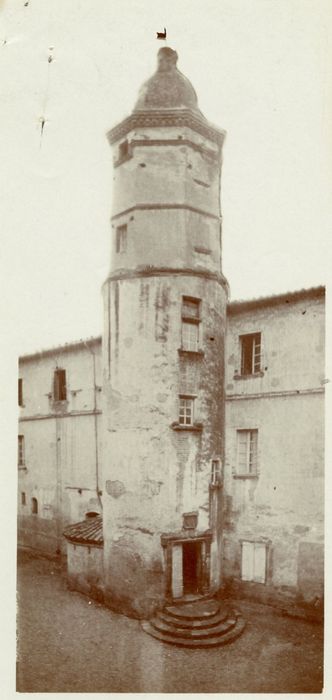 Une tourelle d'escalier située dans la cour, sur la droite, est le seul reste d'un établissement qui a occupé autrefois l'emplacement des constructions actuelles qui doivent dater du début du 19e siècle. La partie basse de la tourelle remonte au 16e siècle, et a été surélevée plus tard d'un étage et d'un pigeonnier, puis couronnée d'un dôme. La porte d'entrée a conservé sa mouluration et les armoiries de l'ancien propriétaire.